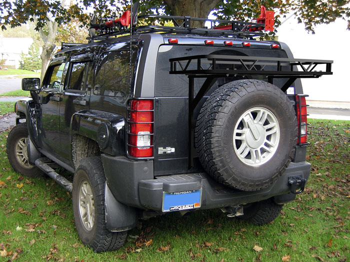 So here it is, I think that putting anymore weight on the already overwieght rear door is a bad idea. Unless you don't plan on keeping your H3 long, I predict that your rear door will begin sagging and will require readjustments becoming more and more frequent. I would put my time and effort somewhere else. Additionaly I think it will make access to your roof rack much more difficult. Not to mention the concern you have of pushing the tire out over and inch. Save your money and get a good adventure trailer. My two cents, hope it helps.:) |