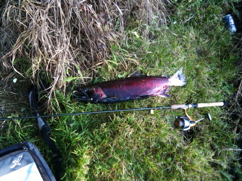 Well, I just got back from having my tires put on and a new alignment. Just makes me love my truk that much more. I think the next thing I'm gonna do it a couple nice lights mounted on the brush gaurd. I'd really like to have a couple polive type lights mounted on the windsheild. I've always thought that would be awesome and functional. After that maybe a snorkel. They're just so damn expensive. Here's a couple pics of a salmon I pulled out of campbell creek yesterday. I didn't think they were still in the streams. But I saw a pair of them. Shamefully I foul hooked him. he went to hit the lure and missed, so the current pushed the lure into is pectoral fin and hooked him pretty good. broke my hook getting it out. I probably could hooked up legally with another cast. Enjoy! And there will be many many more pics of the 3, me, and alaska to come.