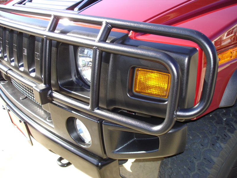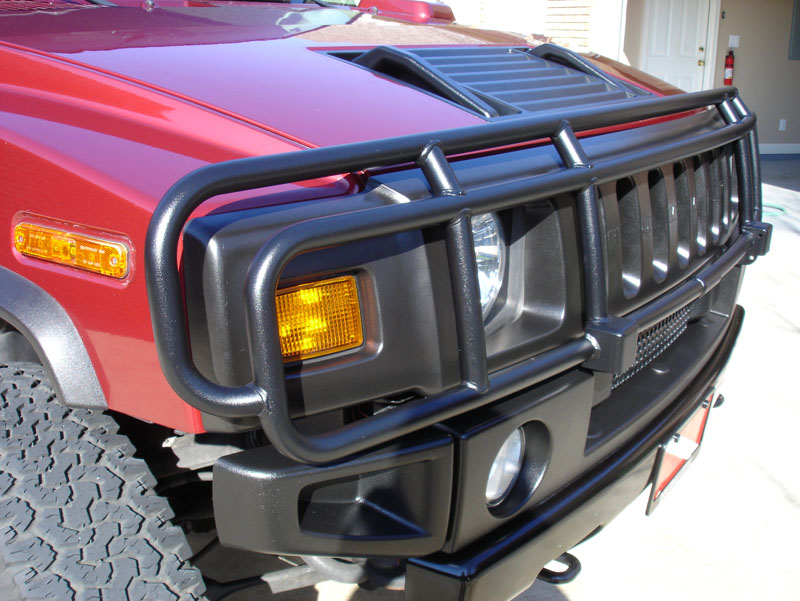 2003 H2 Lux/Adventure, Burgundy, 37x12.5 MTRs on Matte Black Wheels, Smoked Cab/Running Lights, 07 Mirrors, Jet Stage 1 Chip, Volant CF CAI, AirRaid Intake Tube, Bi-Xenon HID, DRL mod w/diode, 2006 TNR, Matte Black Linex on Grilles & Front/Rear Bumpers, Ram Offroad Brush Guard, Rancho 9000 Remote Adj shocks, Rancho 5000 Strg Stab, FFD Ultra Extreme Electric Fans, Moog Pitman/Idler w/Cognito Support Kit, Kryptonite Tie Rods