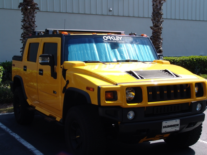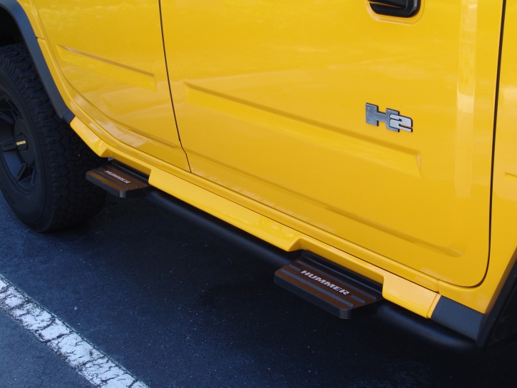 Yellow 2003 H2 Luxury ALPHA , 2" lift, Black Helo Maxx8 20 X 10 Rims, Toyo AT Open Country II LT35/12.50/R20 tires, taillight guards and black LE brush guard, KC light bar w/4 Daylights, Recon Smoked roof lights, Sirius/XM Satellite Radio, Kenwood Head Unit , 4 - 6-1/2 inch Polk Audio Speakers, solid billet tailgate handle,HUMMER H2 Ghost lights ib front doors