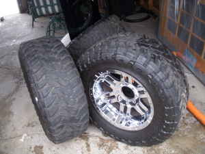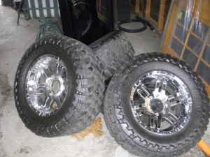 the tires are Toyo Open Country M/T 37x 13.50x 20's..... fronts are about 50% tread and rears are about 40%...... . the rims are 20x10 Moto Metal 951's