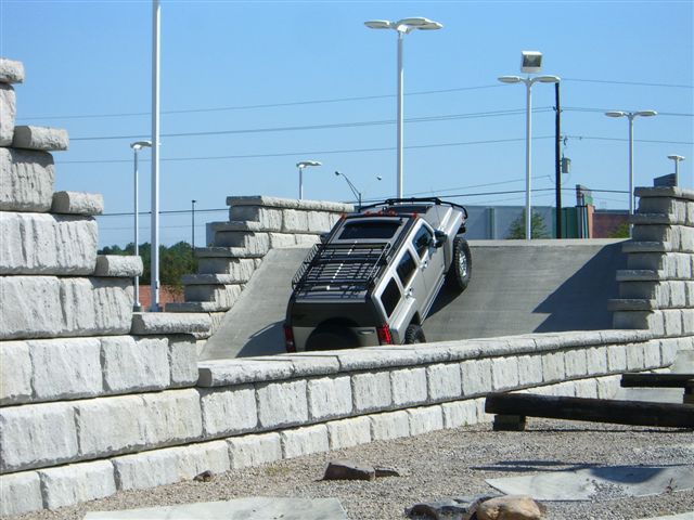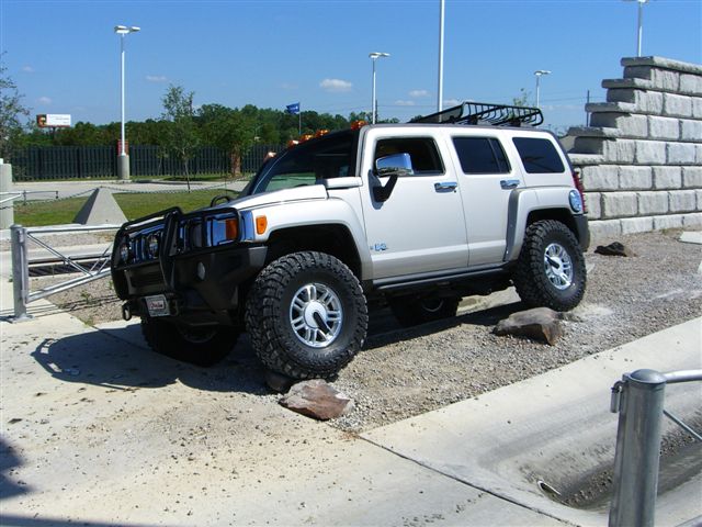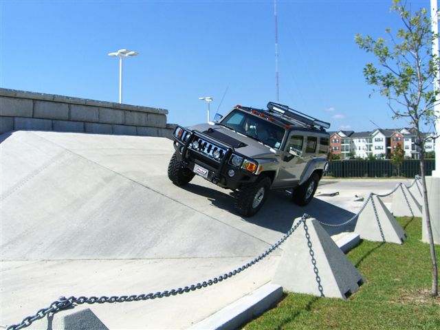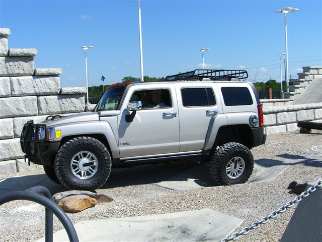 Thank you. Here are a few other pics from my prep weekend at Gerry Lane Hummer. They had a Grand Opening and Happening about 3 weeks ago. They worked with me on the obstacle course for about 45 minutes. Definetly came in handy. Included is a pic of my co-pilot. As far as my H3 Lux, 2 turns on the torsion bars, Toyo MT LT315/75 (thanks Green Lantern/StarsnBars/NEOCON1/etc. for advice), Manik guards/rockers, and Yakima roof rack. 10.75 inches ground clearance, 19 inches (drivers side rocker to ground) and 19.5 inches (passenger side rocker to ground). Handled everything great, but i know now that a locking differential is a MUST for off roading. It just makes certain obstacles so much easier. Coles Creek is in Hammond , LA. I joined a 4x4 club that goes wheeling once a month so my brother and I could off road together and learn how to manever over/around obstacles. He has a FJ Cruiser 4wd (He couldn't have the same type vehicle as his big brother, but i tried). The trails we were on were rough cut mainly for Jeeps. Followed a lifted Nissan Titan the morning run. Didn't worry much there. At Coles Creek on the north side they recommended I did not try it because the H3 had a wider wheelbase than they cut for. Of course a Marine (one of the spotters for the trail) pulled me aside and said he thinks the H3 could make it. Decision made. He really liked seeing the H3 in action. Made it quite a challenge around vines, limbs, etc scrapping the sides. All is well though, very little noticeable damage. Going to fab some magnets and try some spray on bra gunk for the fenders next time. Please offer suggestions for body armor!! My wife said she felt like she was riding a roller coaster. Ice chests falling into the front seat from the back seat, etc. Plus I showed her how you can let your foot completely off the brake/pedal and the H3 calmly climbs downhill by itself. She was amazed!! My brother tried it in the FJ and found gravity taking over before his downhill assist kicked in. Thanks again for the compliments and questions......Brad O.