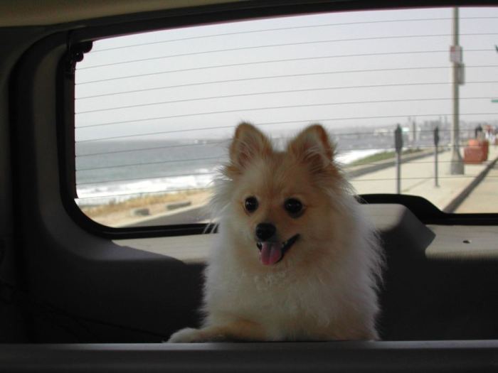 Our Pomeranian, Basia. (Pronounced: Basha) We call this pic, "Peach at the Beach". Taken in the back of the "Heep" Grand Cherokee.