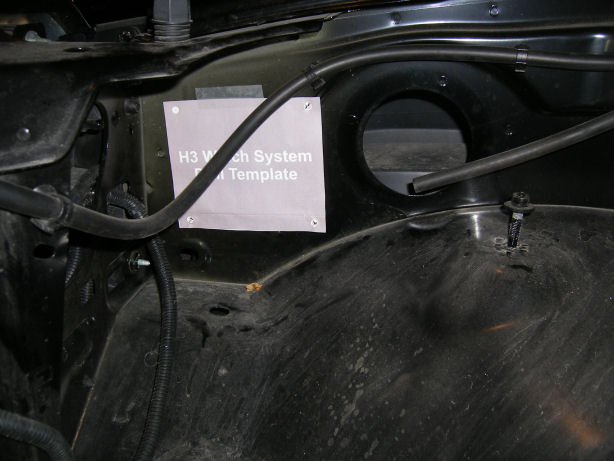 Here is the template that is used to dril the holes that are used to mount the contro box. Note that you only have to use three of the holes. I also had to use a longer bolt in place of one of the factory bolts since I placed the box very far forward and there is a hump on the inner fender wall.