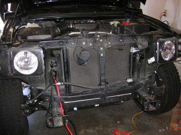 Here's the front end getting ready to thread the cables to the battery. They go behind the remaining plastic component in front of the radiator.