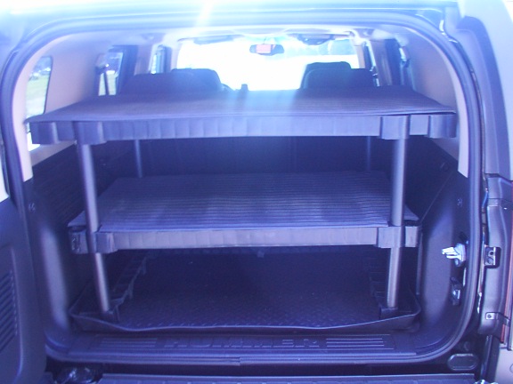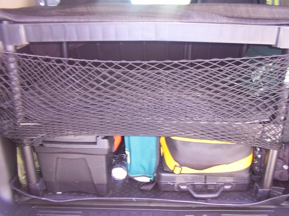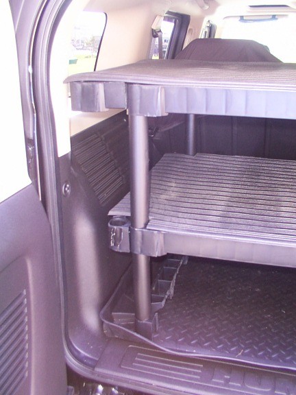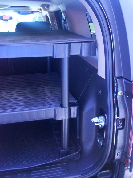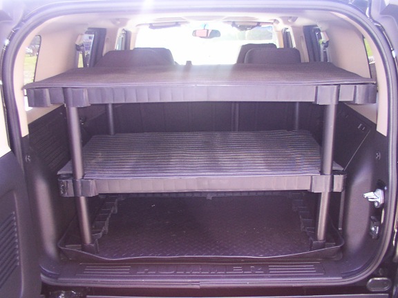 Well, I have plans drawn up and will probably build a storage drawer system for rear this Friday. It will be 8" tall, 41" wide, and 28" deep. This will allow for rear door to close and sloped back of rear seats. It will have two sep. drawers on ball bearing glides, each drawer will have a rubber liner mat, it wiil be bolted down to tie downs, and tie downs will be move to top of unit with large heavy duty rubber mat from Tractor Supply. Will post pics when done.