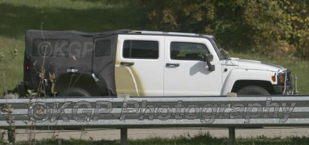 Just days after Bob Lutz announced in Paris that Hummer needs to expand its lineup to include more models, KGP Photography has released some new shots it snapped of what appears to be the much-talked about H3T ? a four door pickup style Hummer, based on the H3. The front is obviously an H3, and the rear fender flares have been removed. I?m not sure why auto-makers always cover up the part that is different ? that?s how you find the part that has changed! I?m guessing they?re covering up what is a flat pick-up style bed in the back. Also ? when you look at the side shot, the vehicle appears to much longer than the current H3 and the H3T concept. Cool news!