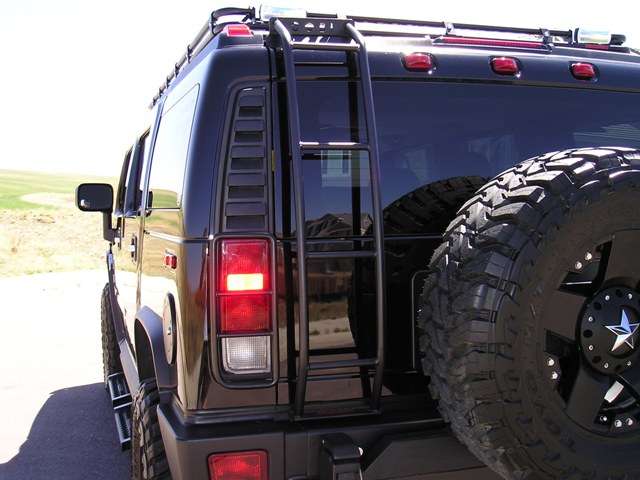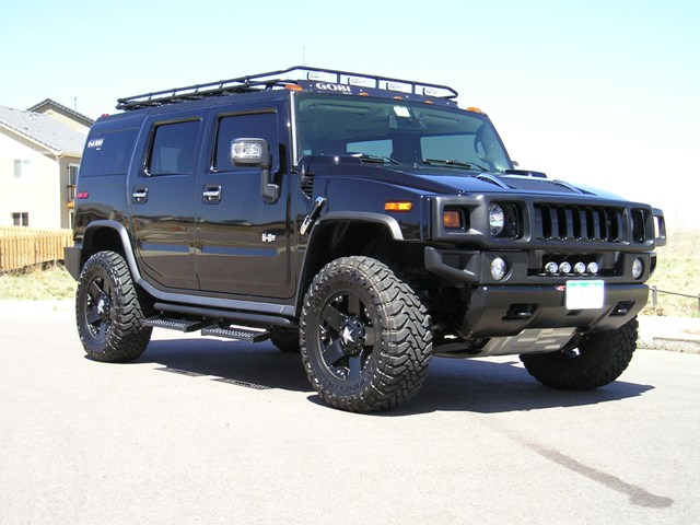 2003 H2, Lux & Adv Packages, Cognito 3" front suspension lift, Gobi Stealth Rack w/ Ladder, Navigation, twin Optima battery setup, AirRaid Intake, Granatelli Mass Air Flow Sensor, Flowmaster Big Block II Exhaust, Diablosport Predator Programmer,Cognito Pitman/Idler Arm Kit, Fabtech Tie Rods, Rancho RS 9000 shocks, Warn bumper and 9.5x winch, Warn light bar, PIAA's everywhere (14), everything blacked out, and rollin' on 39.5" Super Swamper IROKs on black powdercoated stock wheels.