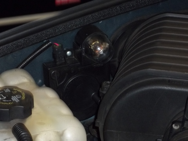 First, I had to look for a place that would be functional without having to modify anything under the hood. The best place I found was on the passenger side between the factory air intake filter housing and the radiator overflow tank. I drilled 3 holes after marking them on side wall of the engine compartment, used 3 sheet metal screws to mount the retractable light.